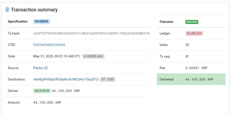 On May 31, 2025, at precisely 09:51 AM UTC, a transaction involving 44,100,000 XRP was executed on the XRP Ledger. The source was identified as Paribu, one of Turkey’s most prominent cryptocurrency exchanges.