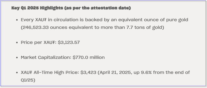 Tether Reports XAU₮ Grows Amid Shifting Monetary Landscape, Releases its First Attestation for Q1 2025, More Than 7.7 Tons of Physical Gold Backing the Token in Circulation