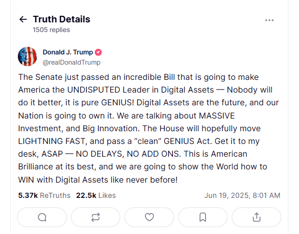 According to his Truth Social post, the Senate “just passed an incredible Bill” that will make the US “the UNDISPUTED Leader in Digital Assets.” He left no room for tweaks or delays, insisting on “NO DELAYS, NO ADD ONS.”
