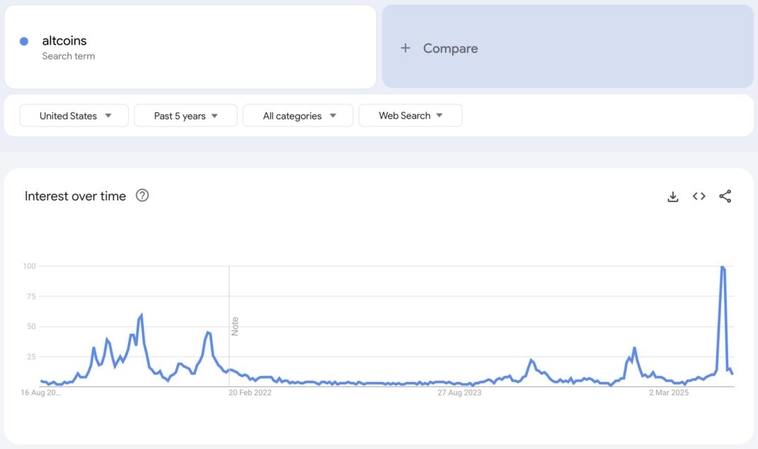Recently, the term “altcoins” saw a surge of interest on Google Trends, quickly reaching an all-time high (ATH). However, within just one week, the search volume collapsed dramatically.