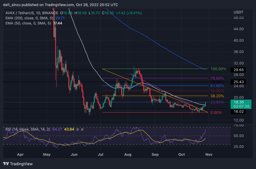 Avalanche (AVAX) has had a difficult year as the price has remained in a downward trend, but the price of AVAX may be about to change as it broke out of its daily descending triangle with good volume. The crypto market has looked more promising recently, with Bitcoin (BTC) and Ethereum (ETH) showing impressive price movement. AVAX’s price has risen from $15 to $18 as it attempts to grab the market by its horns. (Data from Binance)