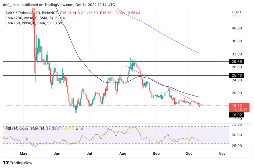 The price of AVAX needs to rally away from key support to avoid price dropping to a low of $10 if the price breaks to the downside of the descending triangle.