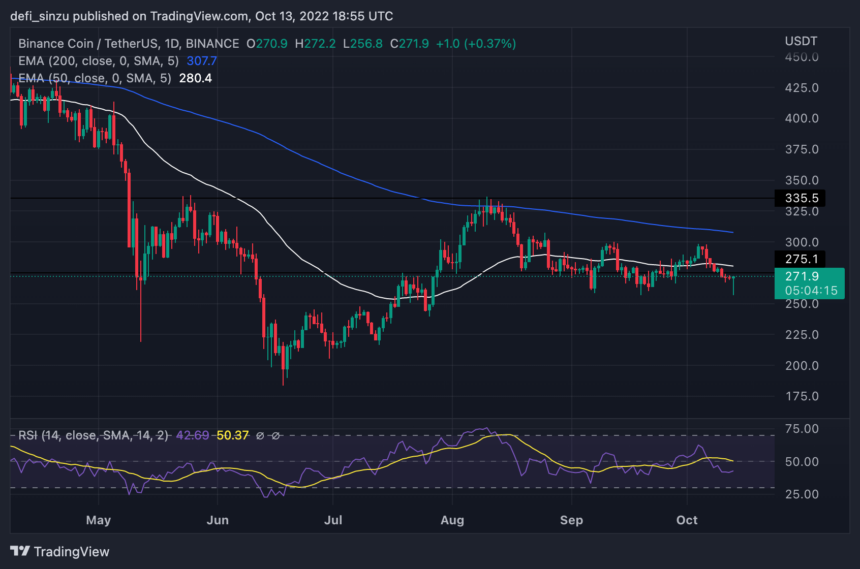 The price of BNB trades at $270 as the price bounced off after a drop to $265. BNB’s price trades below the 50 and 200 Exponential Moving Averages (EMA) as the price needs to flip these regions to become bullish for BNB. The values of $280 and $305 correspond to 50 and 200 EMA as they act as resistance for the BNB price.