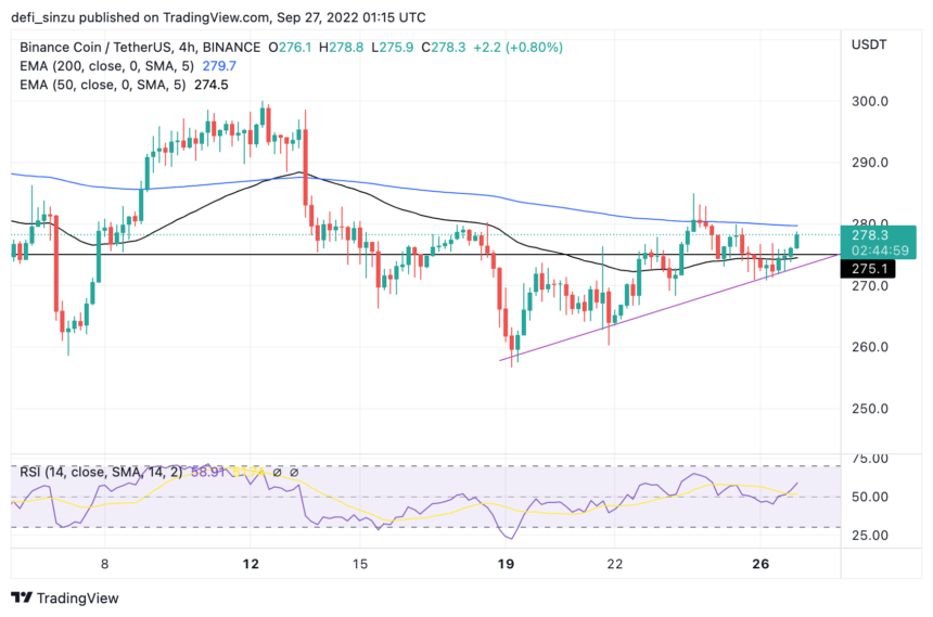 The price of BNB is $278, which is higher than the 50 EMA but lower than the 200 EMA. The 50 EMA acts as a support for the BNB price, while the 200 EMA acts as resistance. Prices at the 50 and 200 EMA for BNB are $274 and $280, respectively.