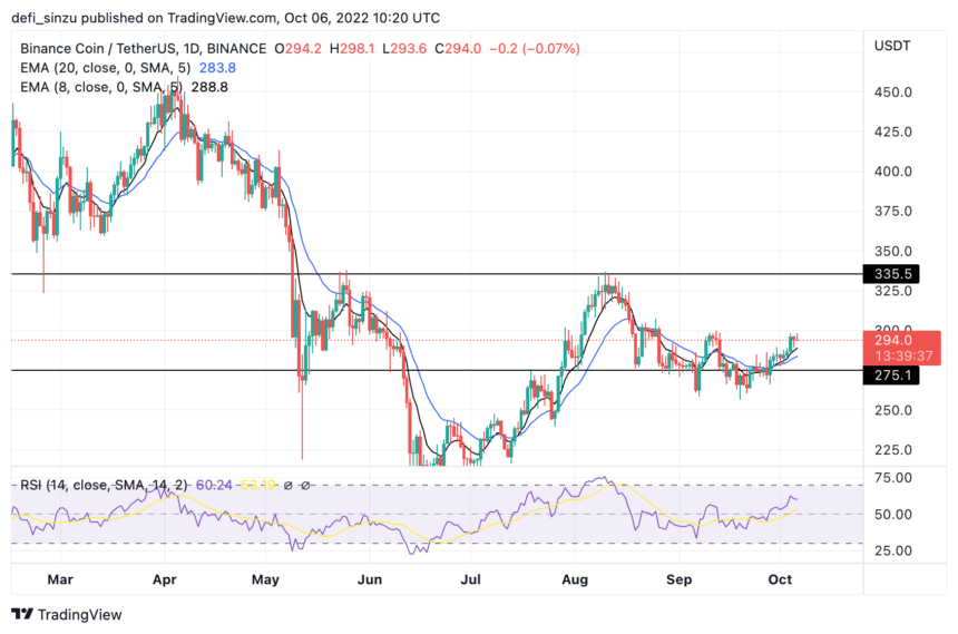 The price of BNB currently trades at $295 above the 8 and 20-day Exponential Moving Average (EMA). The prices of $290 and $280 correspond to the prices at 8 and 20-day EMA for BNB on the daily timeframe.