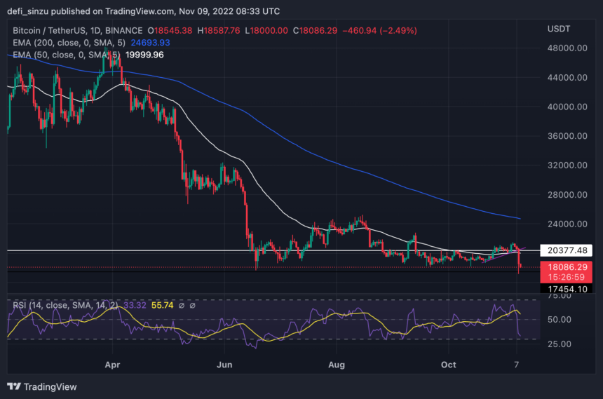 - BTC’s price loses its $18,000 all-time high support as the price trades to a region of $17,000 before bouncing off this region.