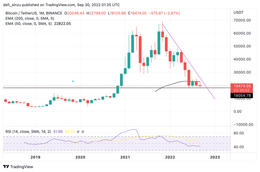 On the monthly chart, the price of BTC has seen more downside than upside, falling from a region of $69,500 to a current value of $19,450, where the price is struggling to close the month on a positive note.