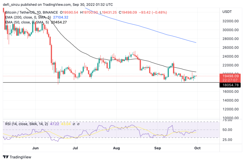 The price of BTC trades at $19,460 below the 50 and 200 Exponential Moving Average (EMA). The prices of $20,500 and $28,000 correspond to the prices at 50 and 200 EMA for BTC on the daily timeframe.
