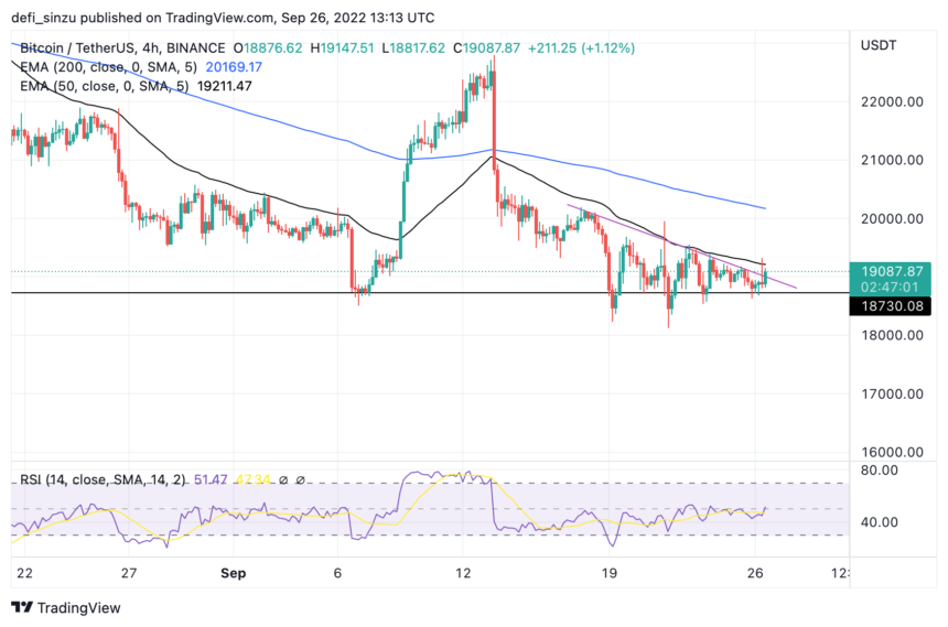 The price of BTC trades at $18,900 below the 50 and 200 Exponential Moving Average (EMA), acting as resistance for BTC price. The price of $19,300 and $20,000 corresponds to the resistance at 50 and 200 EMA for the price of BTC. The price of BTC needs to reclaim 50 EMA for a chance to trend to $20,000.