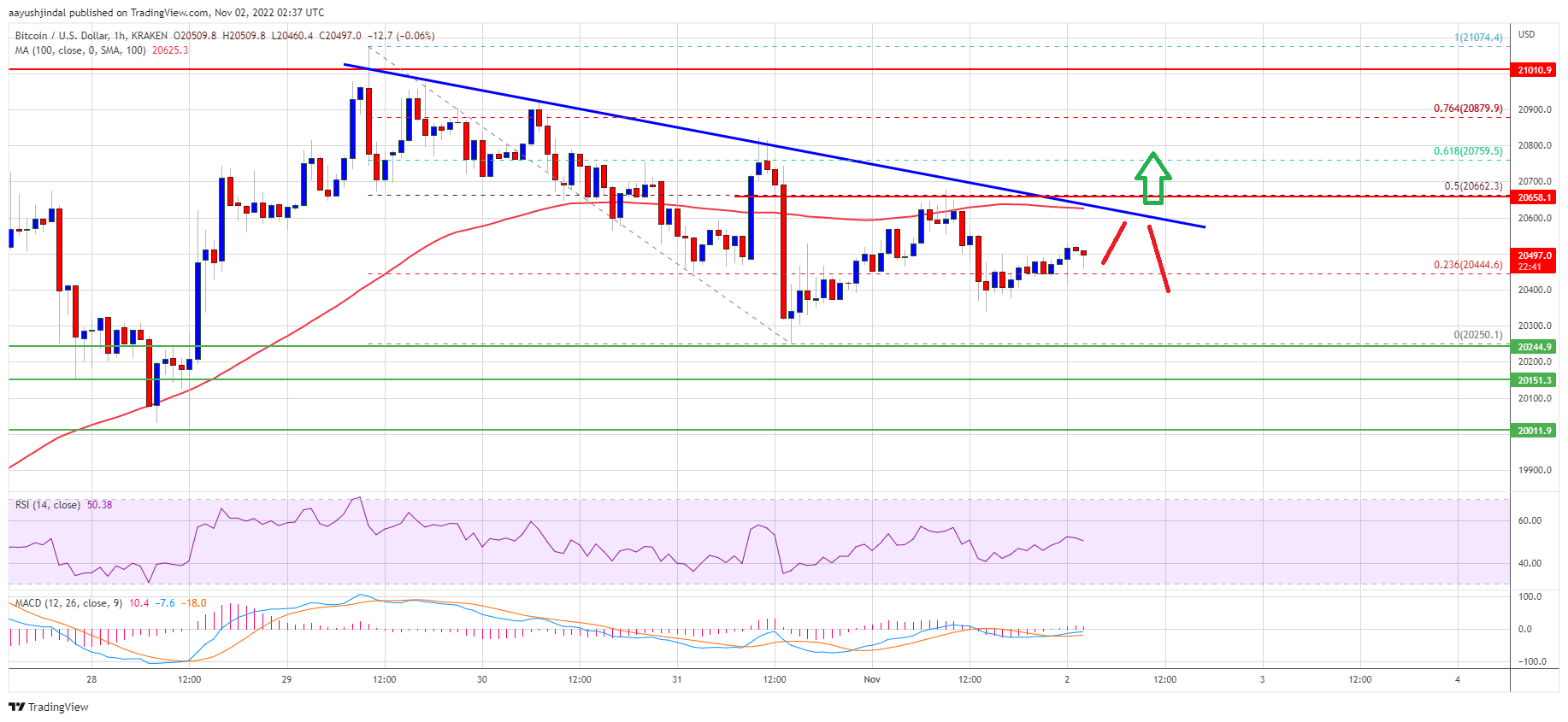 Bitcoin price is currently consolidating below $20,650 against the US Dollar. BTC could start a fresh rally if it clears the 100 hourly SMA and then $20,650.