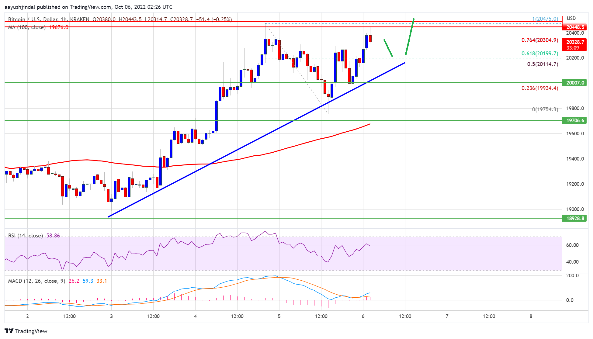 There was a move below the $20,000 support zone, but the price remained supported well above the 100 hourly simple moving average. It traded as low as $19,754 and recently started a fresh increase. There was a clear move above the $20,000 and $20,200 resistance levels.