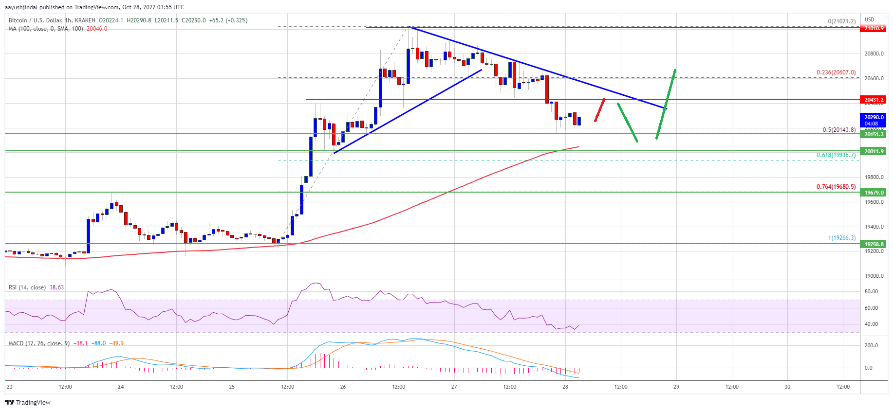 A high was formed near $21,021 before there was a downside correction. The price declined below the $20,800 and $20,500 levels. It even broke the 23.6% Fib retracement level of the key increase from the $19,266 swing low to $21,021 high.