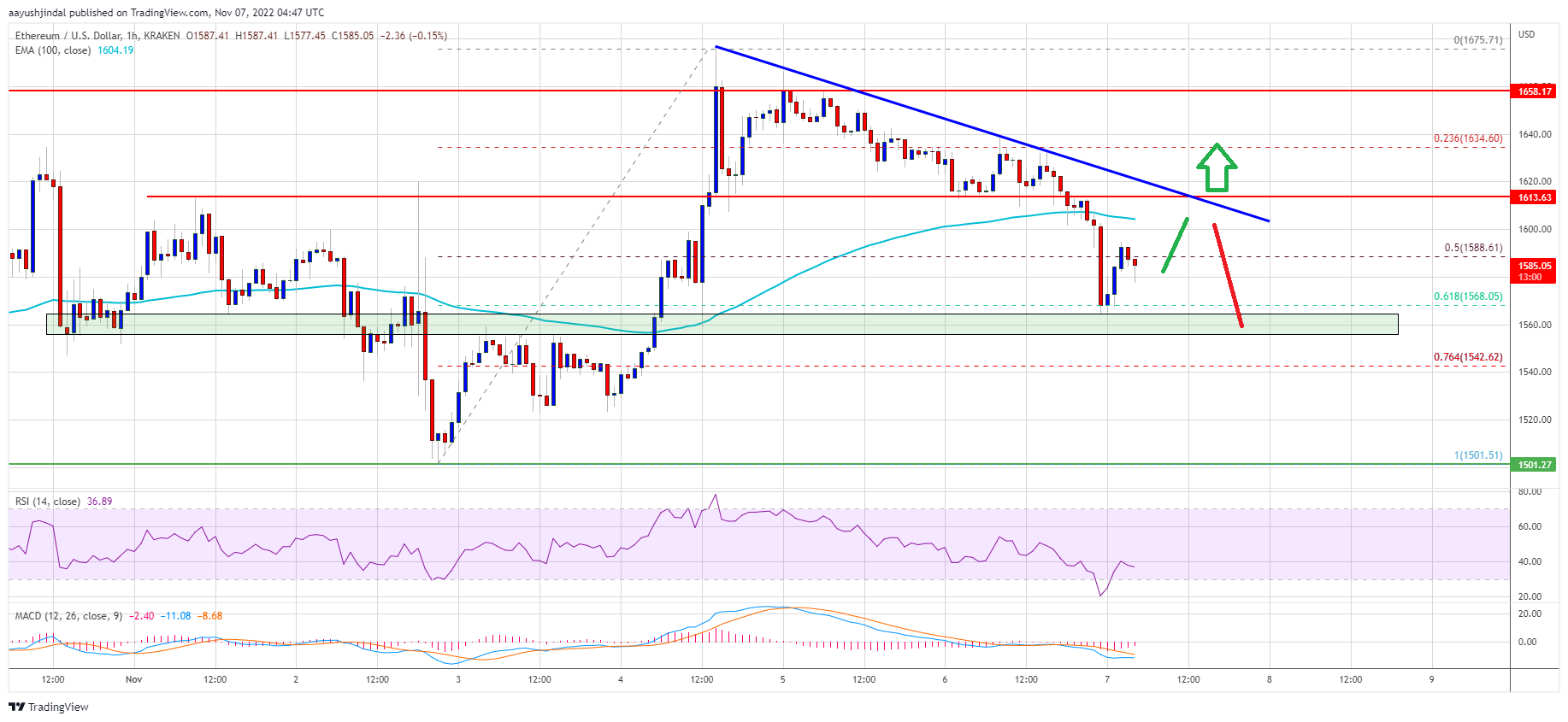 Ether is now consolidating losses below $1,600 and the 100 hourly simple moving average. An immediate resistance on the upside is near the $1,600 level. There is also a key bearish trend line forming with resistance near $1,605 on the hourly chart of ETH/USD.