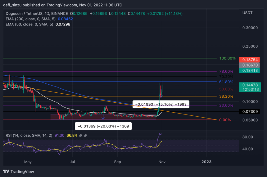 - DOGE’s price shows strength as it continues its rally with eyes set on a high of $0.2.