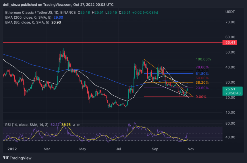 Ethereum Classic (ETC) has remained strong after breaking out of its downtrend descending triangle with good volume, with the price aiming to rally to $30. The cryptocurrency market has appeared more stable this week, with significant price movements in Bitcoin (BTC) and Ethereum (ETH). This new relief rally in the cryptocurrency market has benefited smaller coins like Ethereum Classic (ETC), which has shown real strength in breaking out of its long downtrend movement. (Data from Binance)