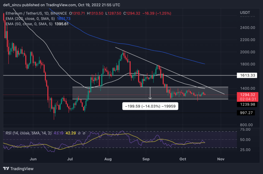 The price of ETH was rejected from a high of $1,430 as the price saw itself move in a range as the price prepared to break either upward or downward.