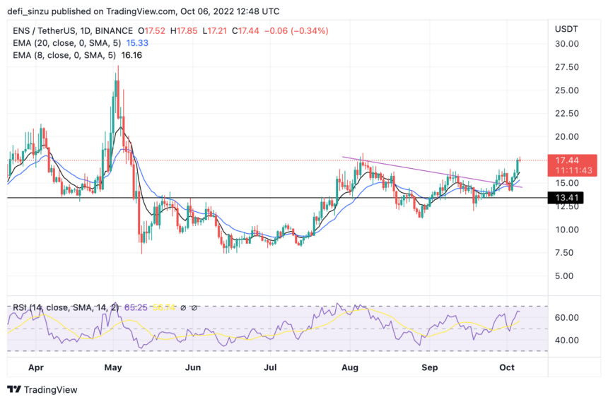 The price of ENS currently trades at $17.4 above the 8 and 20-day Exponential Moving Average (EMA). The prices of $16.2 and $15.3 correspond to the prices at 8 and 20-day EMA for BNB on the daily timeframe.