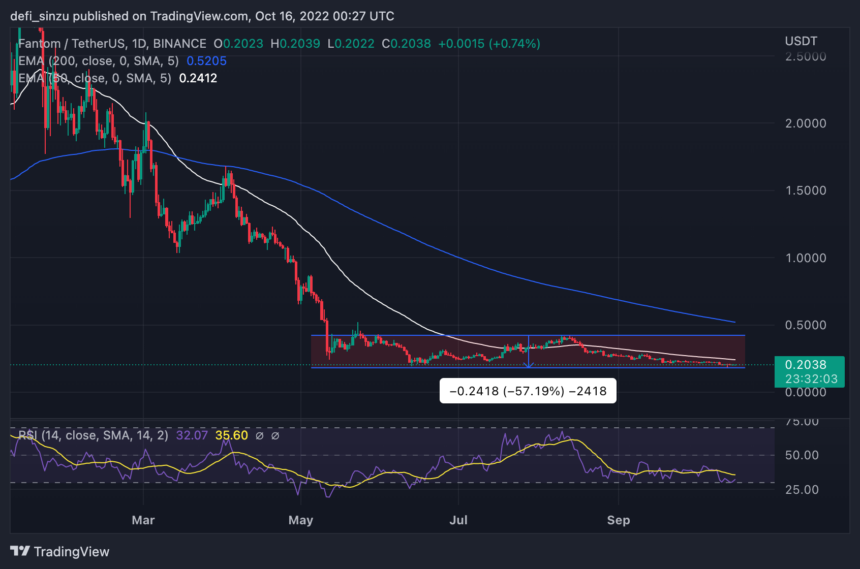 FTM’s price trades at $0.2 as the price continues its movement below the 50 and 200 Exponential Moving Average (EMA); the price of $0.5 and $0.24 corresponds to the 200 and 50 EMA, acting as resistance for the price to break higher.