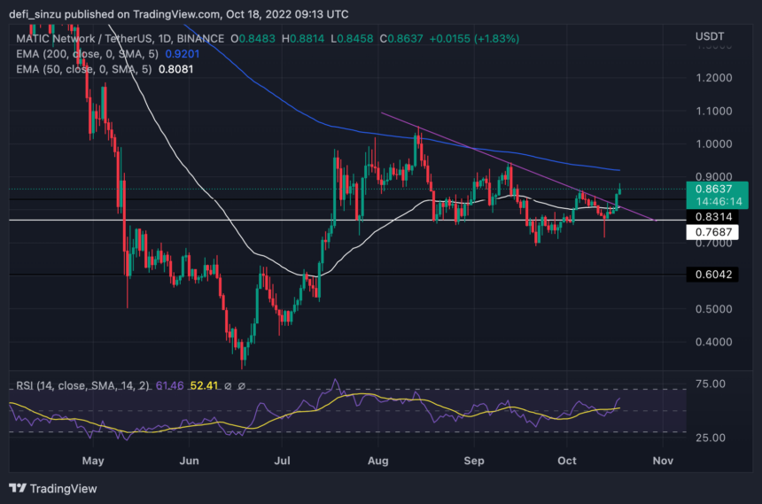 The price of MATIC has shown strength, as the price ranged in a descending triangle to build more buy orders; the price broke out with strong volume and traded above 50 EMA. The price corresponds to $0.8, which acts as a support for the MATIC price. If the price of MATIC reclaims 200 EMA, we could see more price action to a region of $1-$1.2.