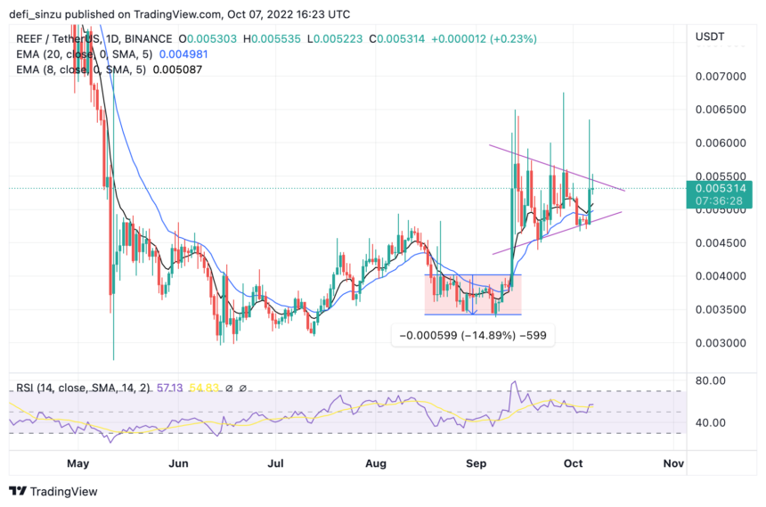 The price of REEF currently trades at $0.0053, just above the 8 and 20-day Exponential Moving Average (EMA). The price at $0.0050 and $0.0048 corresponds to the prices at 8 and 20-day EMA for REEF on the daily timeframe. With the price of REEF holding strong and a possible price continuation, we could see a retest of $0.01 in no time.