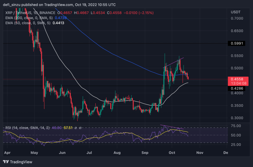 If the price of XRP rejects the downside of price, the price at $0.44 will act as support corresponding to the 50 EMA.