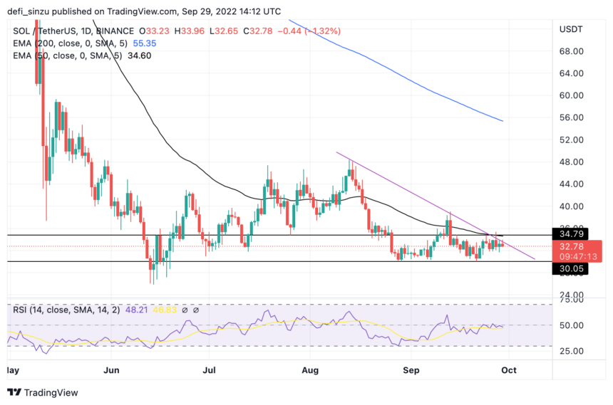 SOL’s price is $33 below the 50 and 200 Exponential Moving Averages (EMA). On the daily timeframe, the prices of $35 and $55 correspond to the prices at the 50 and 200 EMA for SOL.