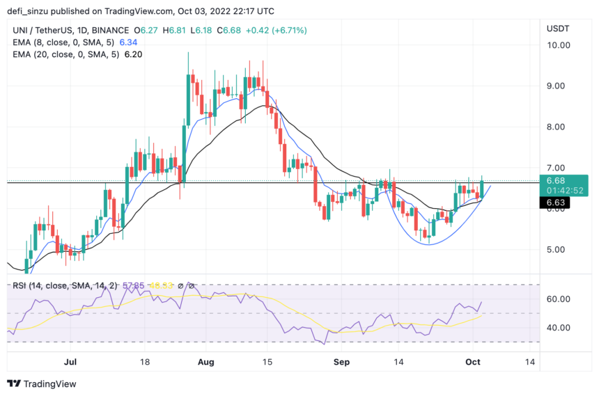 The price of UNI trades at $6.7 as the price attempts to break above the 50 and 200 Exponential Moving Average (EMA). The price at $6.3 corresponds to the price at 50 and 200 EMA for UNI on the daily timeframe.