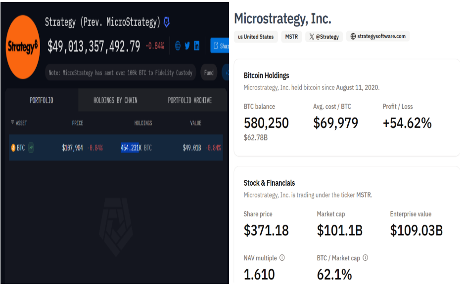 While Arkham tags 454,231 BTC and an additional 70,816 BTC belonging to MicroStrategy, Bitcoin Treasuries shows 580,250 BTC.