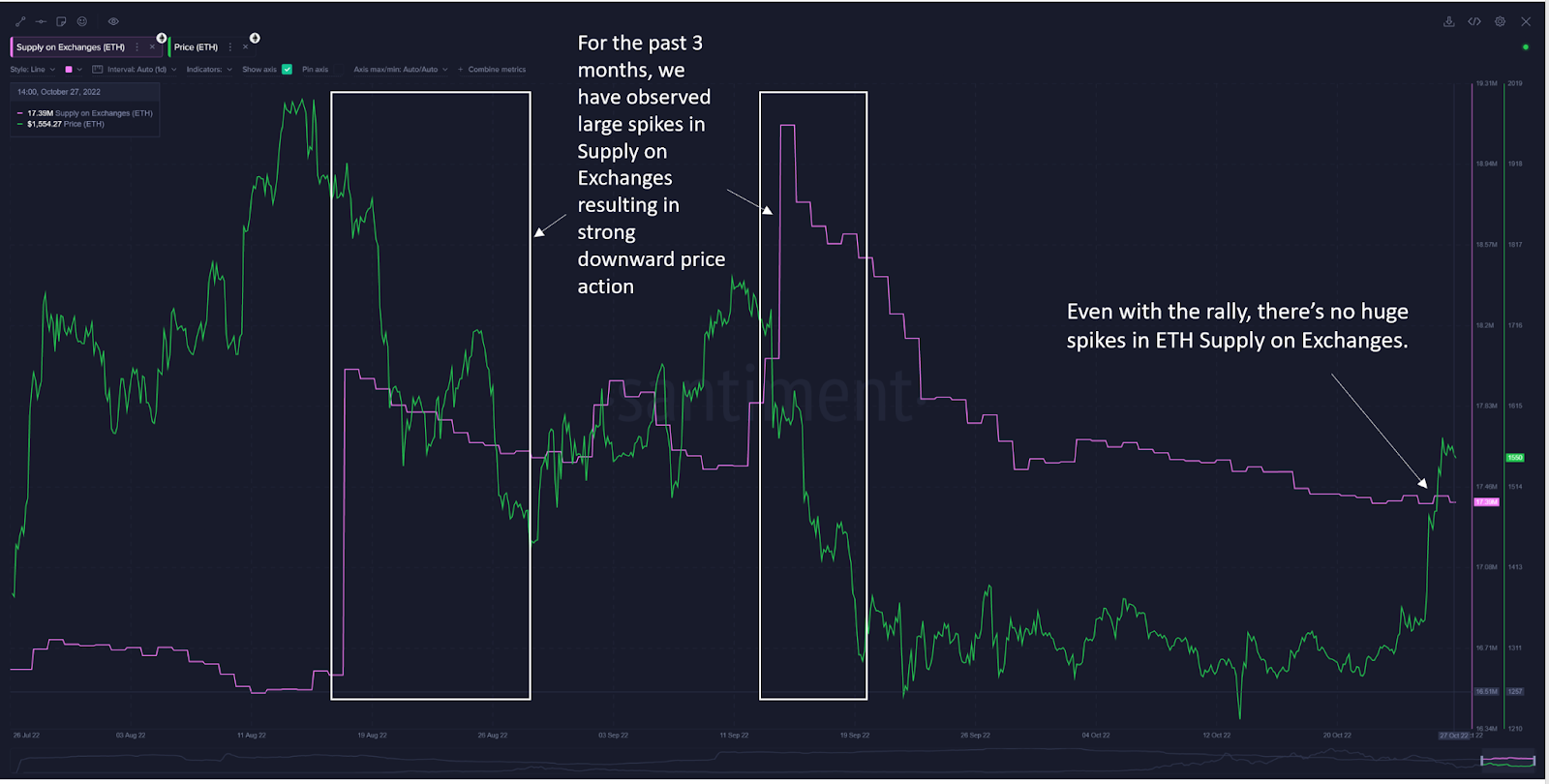 When Ethereum price rallied for a short span in August and September, there was a huge spike in ETH supply on exchanges, indicated by the purple line. However, as seen in the chart from Santiment, there is no spike in the ETH supply on exchange with the current rally.
