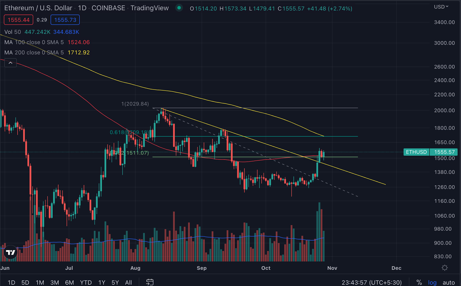 Unlike Bitcoin, Ethereum price has managed to conquer the 0.382 Fibonacci retracement level from the August highs. ETH price is holding support from the 0.382 level now. Not just that, it has closed above the 100-day SMA.