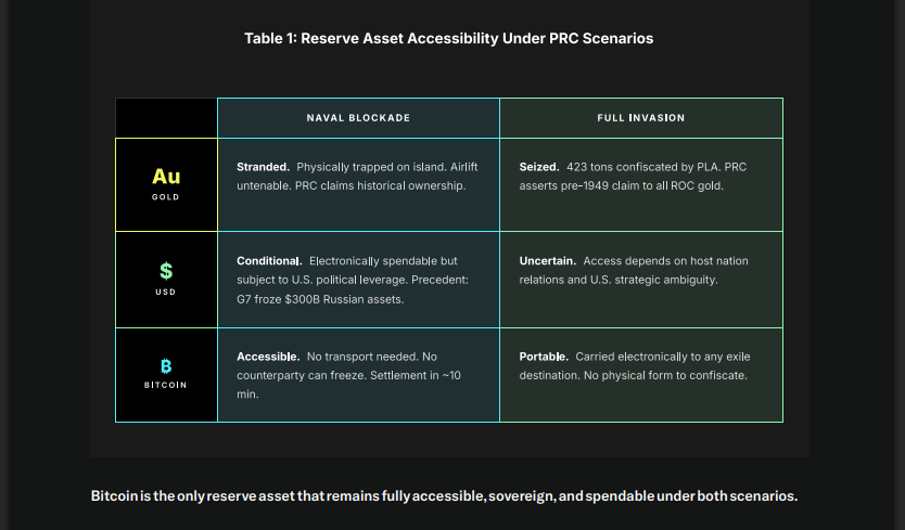 His argument is simple: if China cuts Taiwan off, gold cannot be moved and dollar reserves can be frozen. Bitcoin, he wrote, requires no physical transport and remains accessible regardless of what happens on the ground.