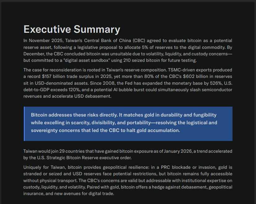 Bitcoin, he argued, could pair with gold to offer a buffer against those risks, giving Taiwan’s central bank a hedge before other countries make the same move.