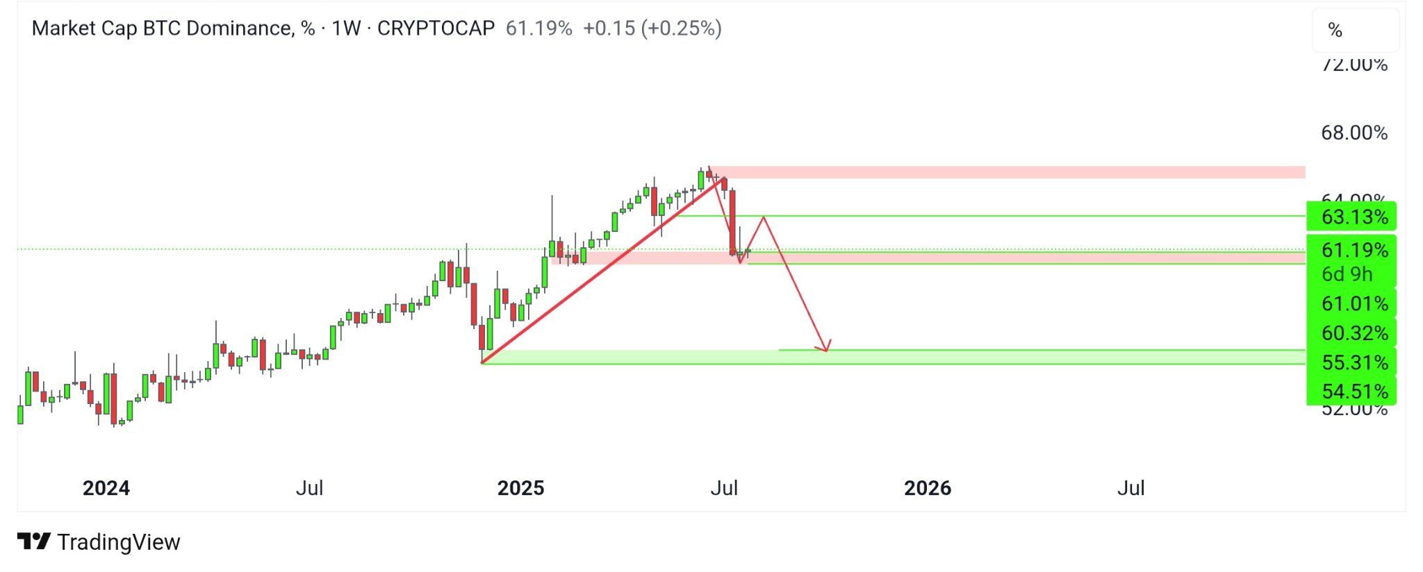 However, not everyone agrees that Altseason will kick off immediately. Some analysts argue that BTC.D is still hovering within the 60–61% demand zone, which could act as a strong support level that helps Bitcoin maintain its market share in the short term.