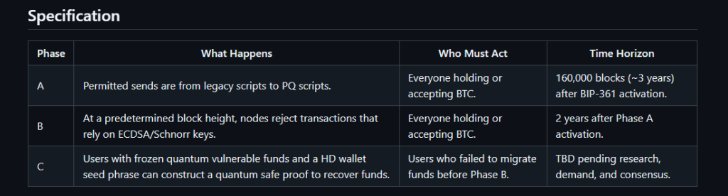 The full proposal is a three-phase plan designed to protect Bitcoin from a threat that has quietly grown more serious: the eventual ability of quantum computers to crack the cryptographic keys protecting early Bitcoin addresses.