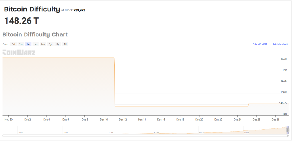 Based on CoinWarz estimates, the next adjustment on January 8, 2026, at block 931,392, is expected to push the difficulty to past 148 trillion.