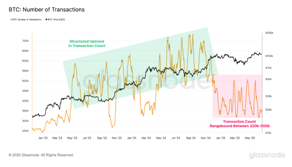 According to a report looking at various on-chain metrics from on-chain analytics company Glassnode, Bitcoin has mostly been highlighted by quiet blockchain activity despite its current price foray above $100,000. For example, daily transactions have now dropped to a range between 320,000 and 500,000, down from a peak of over 730,000 in 2024. This is a significant decrease in throughput for a network operating in a bullish price environment.