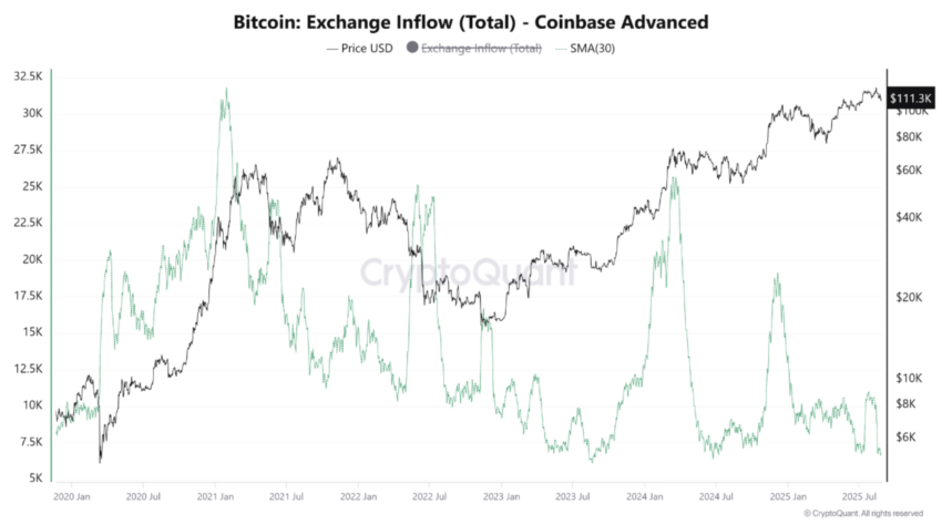 Bitcoin’s price is on the rise again. It dropped to $108,600 on Tuesday, but it quickly, but briefly, rebounded above $112,000. Selling pressure briefly increased, causing a spike in exchange inflows. Now, those inflows are falling again.