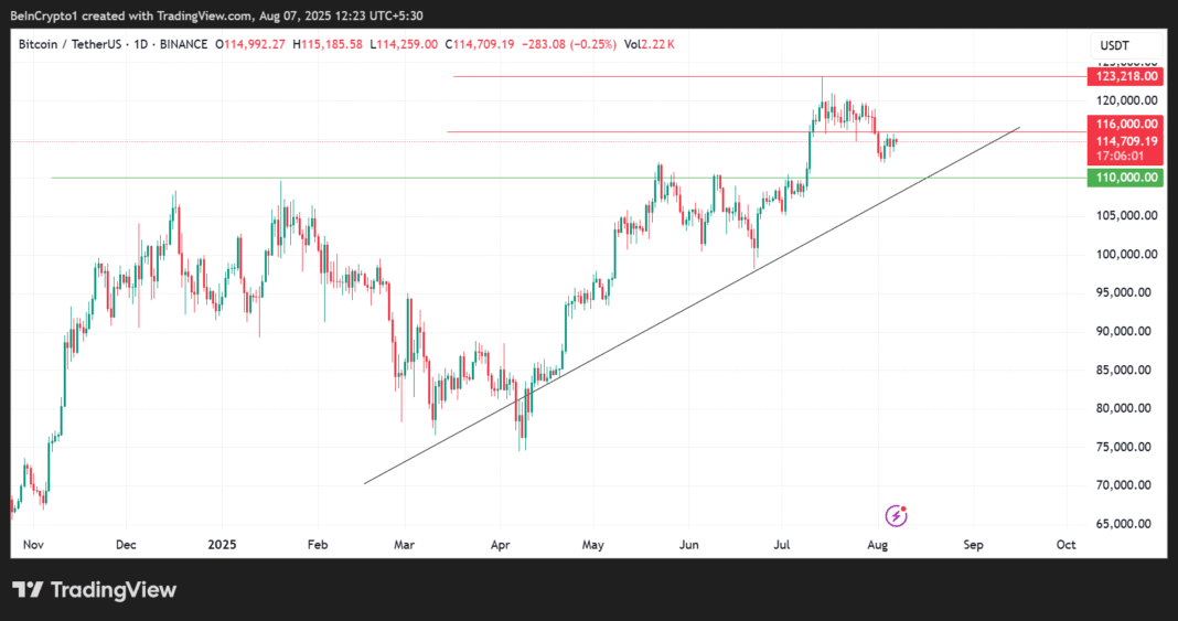 The Bitcoin price still hovers below the key resistance at $116,900, now the cost basis for short-term holders who bought near the local top.