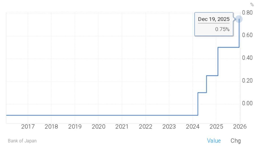 The Bank of Japan (BOJ) raised its policy interest rate by 25 basis points to 0.75% on December 19. It marks its highest level in nearly 30 years, reinforcing the country’s gradual exit from ultra-easy monetary policy.