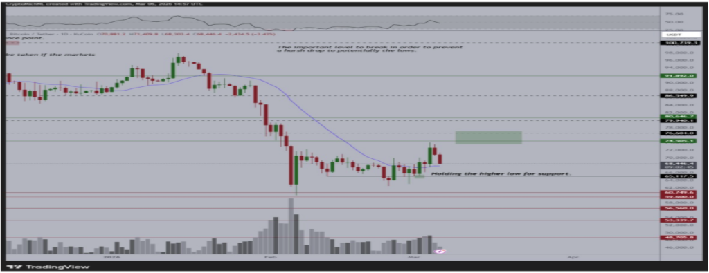 As geopolitical tensions escalate and market volatility rises, Bitcoin’s next price direction remains uncertain. Consequently, analysts like Michael van de Poppe maintain a broadly bearish outlook, predicting steeper declines between $60,000 to $48,000 for BTC.