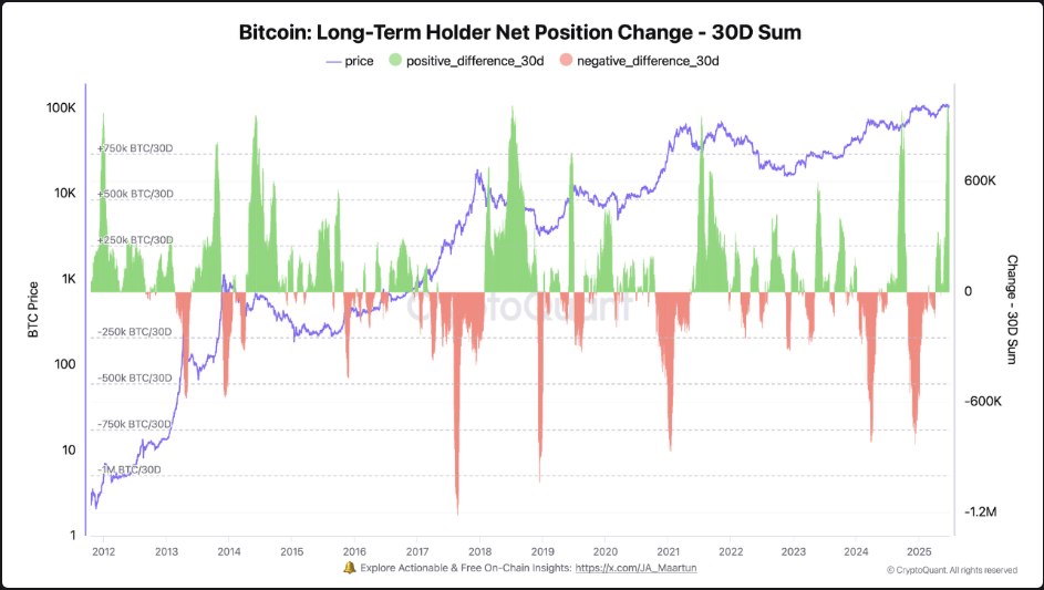 According to CryptoQuant, the 30-day change in long-term holder supply just hit +800,000 BTC. That level has only been seen six times before. It shows real faith from investors who’ve held coins through every dip and rally. They’re shrugging off a market that’s already trading north of $100,000.
