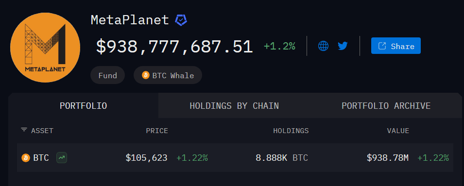 Based on reports, the company’s average cost across all its Bitcoin purchases stands at $93,354 per BTC. With 8,888 coins now in hand, Metaplanet has so far invested close to $830 million. At today’s prices, that stash is worth around $932 million, leaving the firm with an unrealized gain of nearly $103 million.