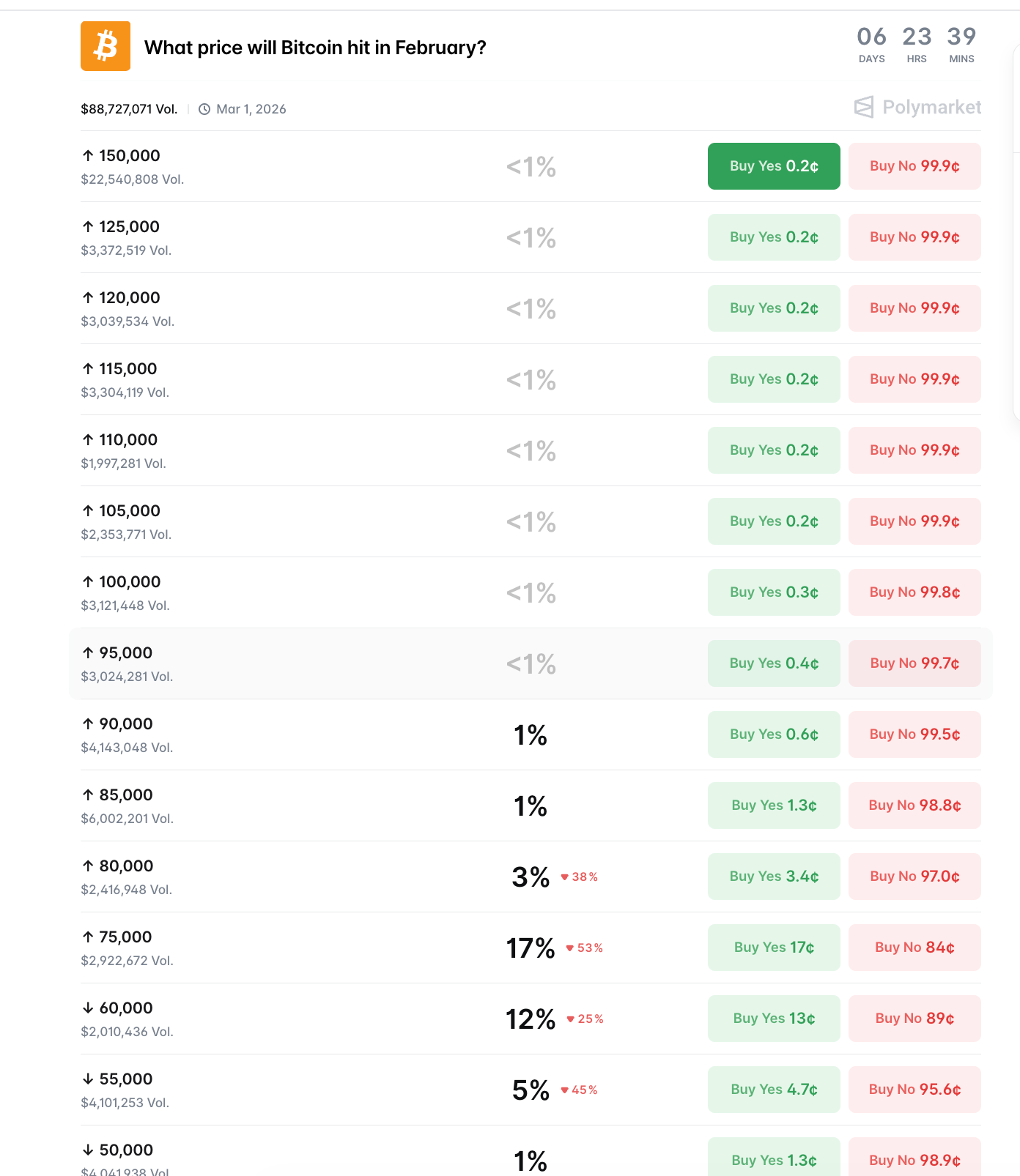 Prediction market data shows ‘above $75,000’ remains the most favored February target despite weakening sentiment. Polymarket volumes, for this bet, exceed $88 million, with millions in active liquidity.