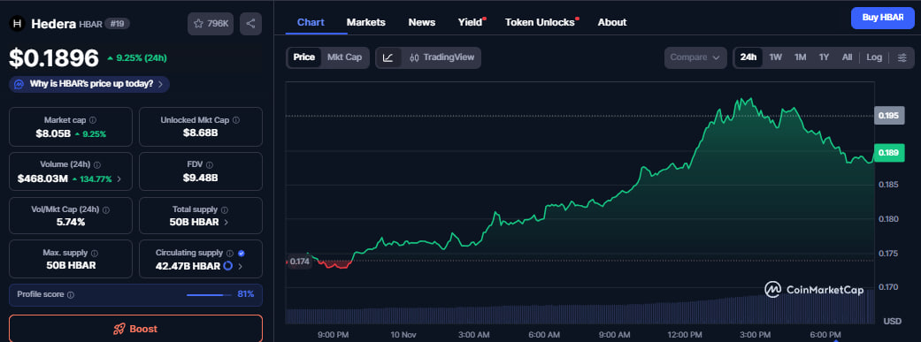 Hedera’s native token trades at $0.1896 after gaining more than 9% the past 24 hours.