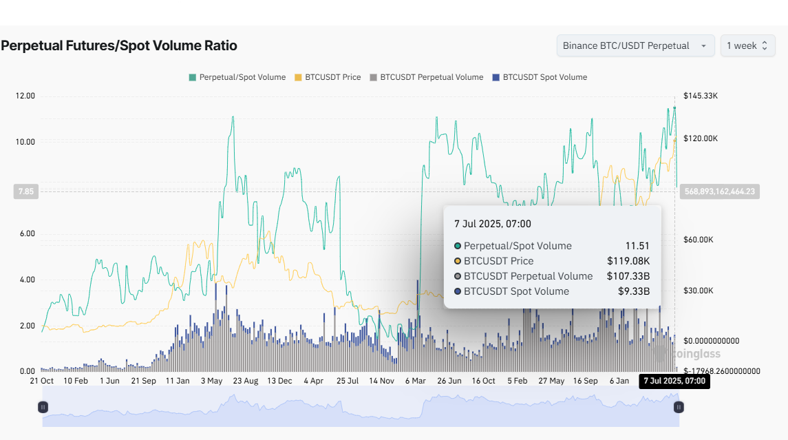 According to Coinglass, Bitcoin’s futures trading volume last week was over 10 times its spot trading volume. The Perpetual Futures/Spot Volume Ratio reached 11.5, the highest in history.