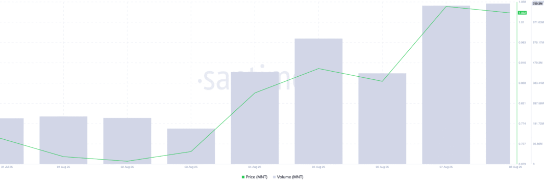 Mantle has emerged as the top-performing altcoin over the past week, with its price surging more than 45%. According to Santiment, this price rally has been accompanied by a steady increase in daily trading volume.