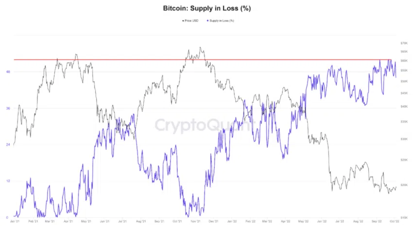 CryptoQuant data shows that the price bottoms during previous cycles normally occur when the percentage of supply in loss reaches 50% or more.
