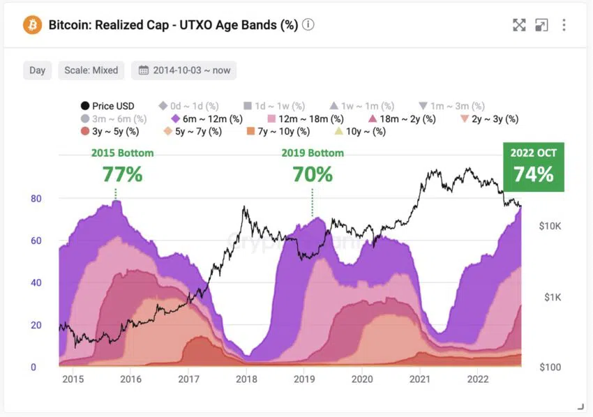 Apart from the hashrate, Bitcoin accumulation levels also reached a 7-year high. CryptoQuant data shows that 6-month-old and older Bitcoins now make up 74% of the realized cap. During the 2019 and 2015 bottoms, this score sat at 70% and 77%, respectively.