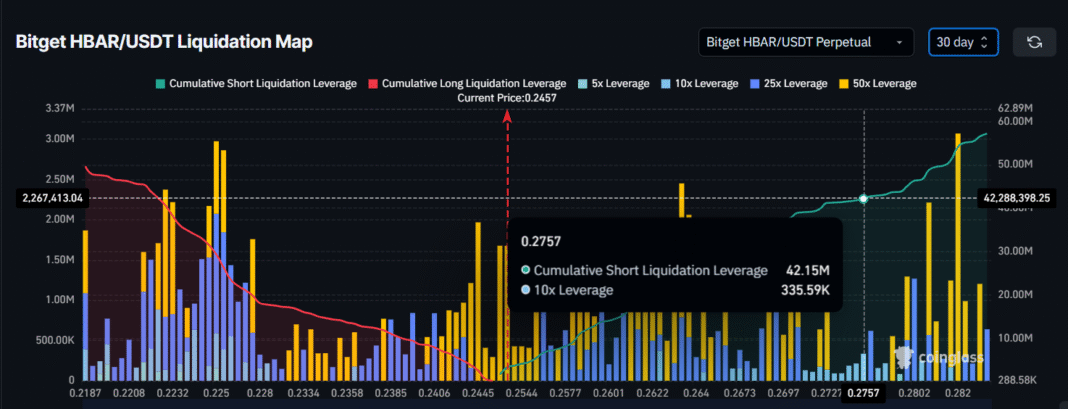 Recent data from the liquidation map reveals that about $42 million worth of short contracts could be liquidated if HBAR manages to recover and reach the $0.276 resistance level. This price point serves as a significant barrier to HBAR’s recovery.