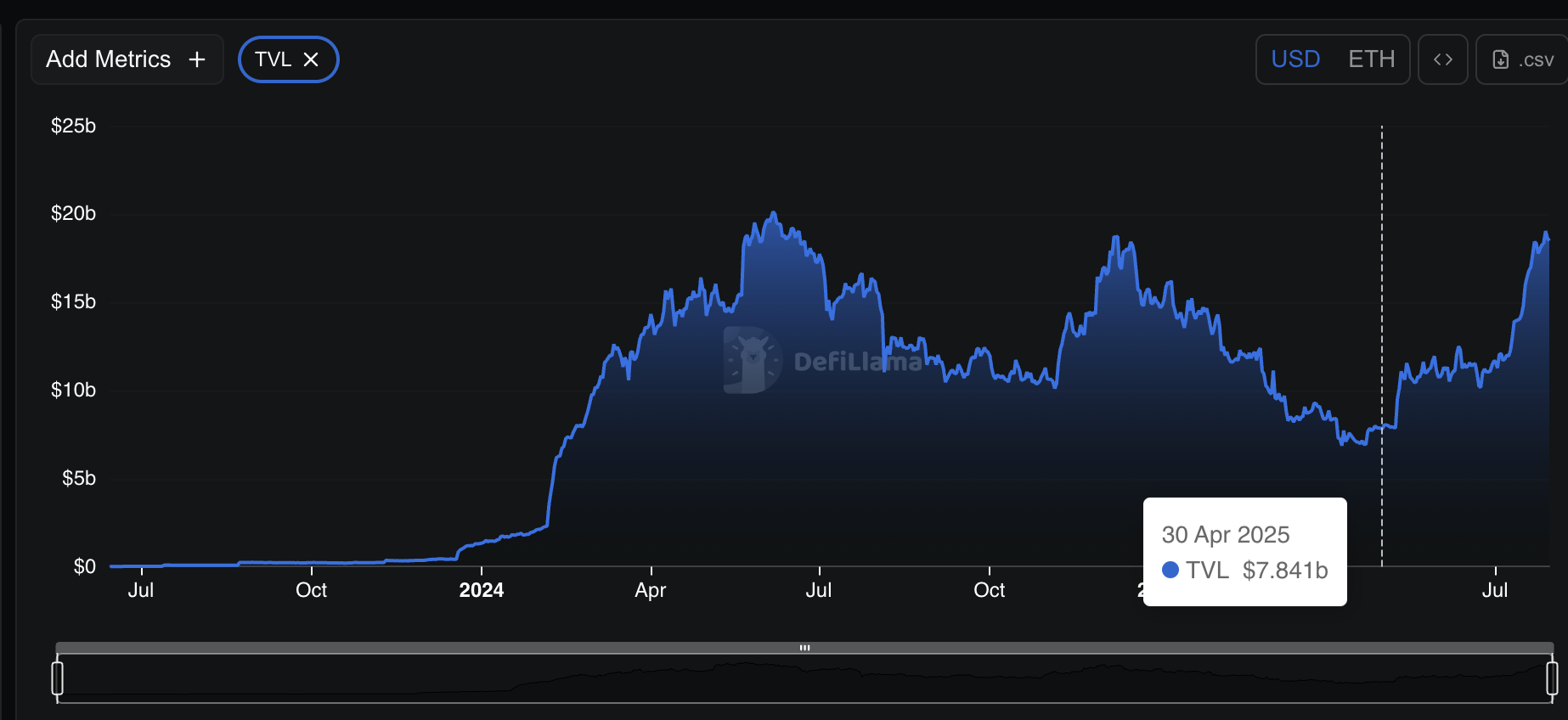 Ethereum’s July rally hasn’t just boosted staking; it’s unlocked a second wave of yield opportunities through restaking, where users take liquid staking tokens like stETH or eETH and redeploy them on EigenLayer-backed platforms to earn extra rewards.